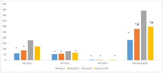 Rat Serum Alanine Aminotransaminase (ALT), Aspartate Aminotransferase (AST), gamma-glutamyl transferase (GGT), Glucose. *: p < 0.05: Compared to Group IR; &: p < 0.05: Compared to Group C; Group C: Control group; Group CO: Cerium oxide group; Group IR: Ischemia-reperfusion group; Group CO-IR: Cerium oxide-Ischemia-reperfusion group.
