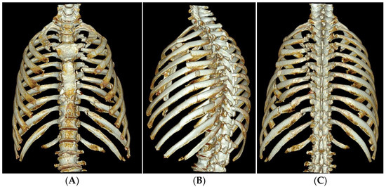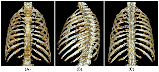 The 3D reconstructed images of the rib CT taken after rib fixation. Anteroposterior (A), left oblique (B), and posteroanterior (C) views of the 3D reconstruction images show successfully plated rib fractures.