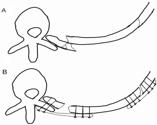 A graphical representation of SSRF for this case. (A) The medial rib close to the spine was comminuted and displaced with sharp edges facing towards the descending aorta. (B) The comminuted fragments were removed, and the broken rib medial segments were approximated as much as possible. However, due to muscular attachments along the rib, a floating portion could not be amended, and medial approximation, in turn, resulted in a dehiscence of the lateral fracture site.