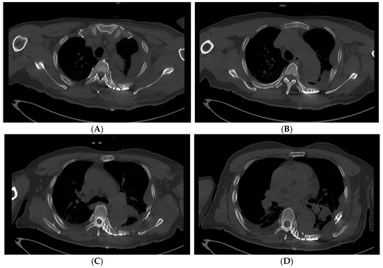 Axial view images of the post-operative rib CT showing costovertebral plating. The previously displaced 6th rib fragment (C) threatening the aorta is now aligned along with other flail segments (4th–7th, A–D).