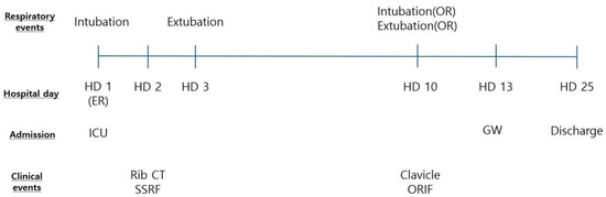 A longitudinal incision was made along the left border of the thoracic spine. Because the posteromedial fracture lines were very close to the spine and the short, fractured segments were adjacent to each other, it was impossible to secure the plate landing zones on the ribs. Therefore, the short segments were removed to decrease the risk of organ injury. With the help of a spine surgeon, rib plating (JEIL ARIX rib system, Jeil Medical, Seoul, Republic of Korea) was performed on the 4th to 7th ribs, with the medial sides of the plates anchored on the transverse processes of the thoracic spine. However, the removed segments left a space even after an effort at approximation, and the plates were placed across short floating spaces, which measured approximately 1.2 cm (Figure 3). Subsequently, a separate oblique incision was made, and the posterolateral aspects of the fractured 5th to 8th rib segments were plated for further stability and to attenuate tensile stress on the medial plates along floating portions (Figure 3, Figure 4 and Figure 5). The lung and descending aorta were inspected through a thoracotomy, and no injury was evident other than lung contusions. The pleural cavity was thoroughly irrigated, and a chest tube was placed for the management of hemopneumothorax. The following day, the patient was weaned from the mechanical ventilator and extubated. The high-flow nasal cannula was initially applied for respiratory support and was slowly tapered according to the patient’s respiratory status and ability, and the chest tube was removed on postoperative day 8. The patient required one additional general anesthesia for clavicular fracture fixation on the 10th hospital day (HD) but did not require mechanical ventilatory support post-operation. The patient was discharged from the ICU on HD 13 without clinical and pathological respiratory complications such as pneumonia and was discharged from the hospital on HD 25 after post-operative management. The patient reported minor chest pain, and a chest X-ray taken during an outpatient follow-up after discharge showed no complications (Figure 6). Figure 7 presents a timeline of the clinical hospital course of the patient.