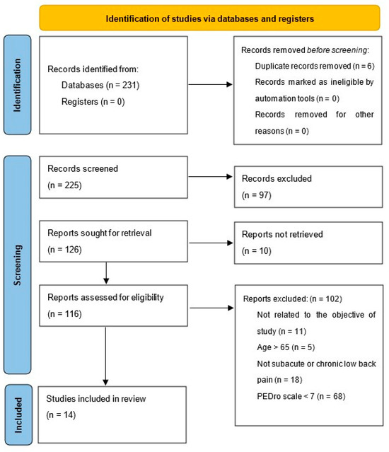 From an initial corpus of 231 studies identified via searches in the PubMed, PEDro, CINAHL, Cochrane, and SCOPUS databases, six duplicates were removed. Title and abstract screening subsequently excluded 98 studies for irrelevance. A detailed full-text evaluation led to the further exclusion of 127 studies due to reasons including irrelevance to the study topic, exceeding the age limit, unavailability of the full text, nonspecificity regarding low back pain types, and subthreshold PEDro scores. Ultimately, 15 studies met the inclusion criteria for the review [23,24,25,26,27,28,29,30,31,32,33,34,35,36,37]. The flow diagram in Figure 1 delineates the selection process.