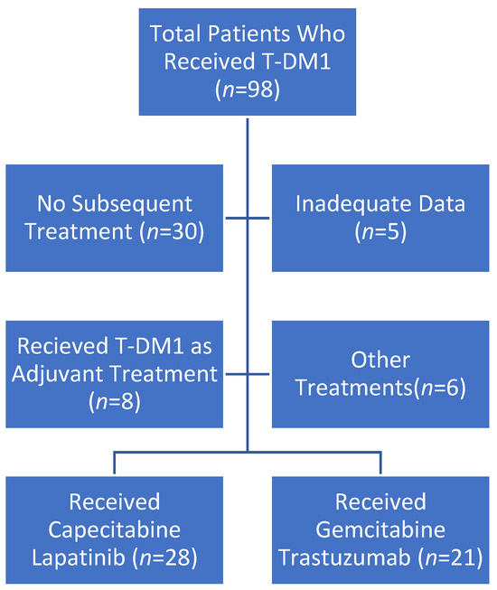 This study involved a retrospective review of the medical records of 98 patients with HER2-positive MBC who received third-line therapy after T-DM1 treatment failed and were followed up with between February 2017 and September 2023. Subsequently, we divided the patients into two groups based on whether they were treated with gemcitabine plus trastuzumab (GT) or lapatinib plus capecitabine (LC) after T-DM1 failed in the second-line setting, which is the preferred second-line therapy in our clinic. Patients who received trastuzumab before the re-challenge had been on treatment for at least six months and had at least stable disease at their 3-month evaluations (Figure 1).