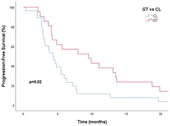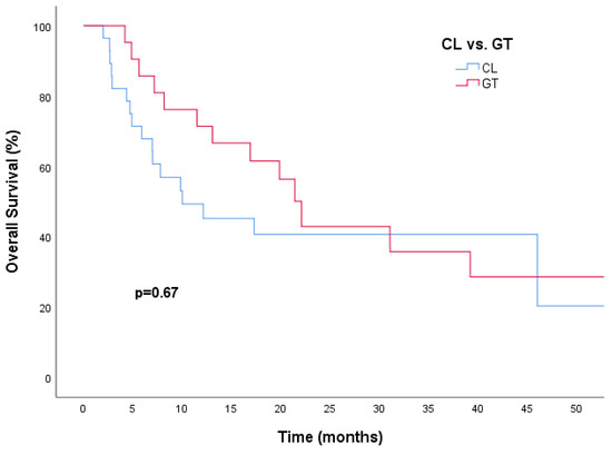 Furthermore, GT was associated with a numerically better median OS in univariate analyses (22.1 months vs. 10.0 months, HR, 0.67; 95% CI, 0.33–1.36; p = 0.26) compared to the CL group, and this difference was found to be significant in the multivariate analysis (HR, 0.67; 95% CI, 0.33–1.36; p = 0.02) (Table 3).
