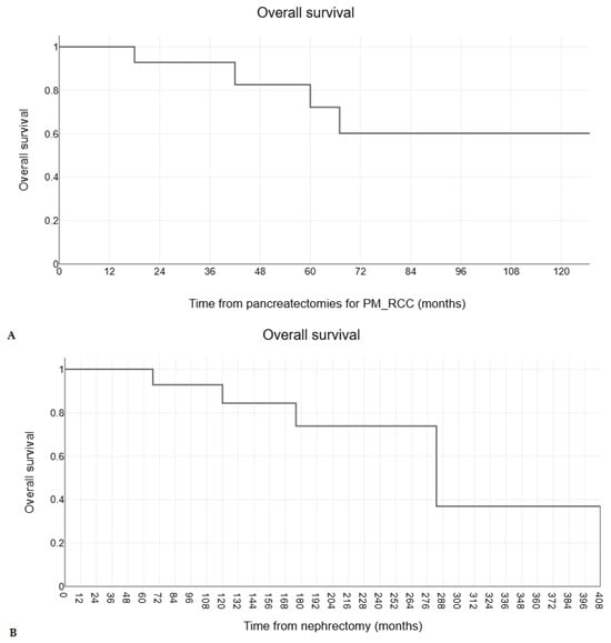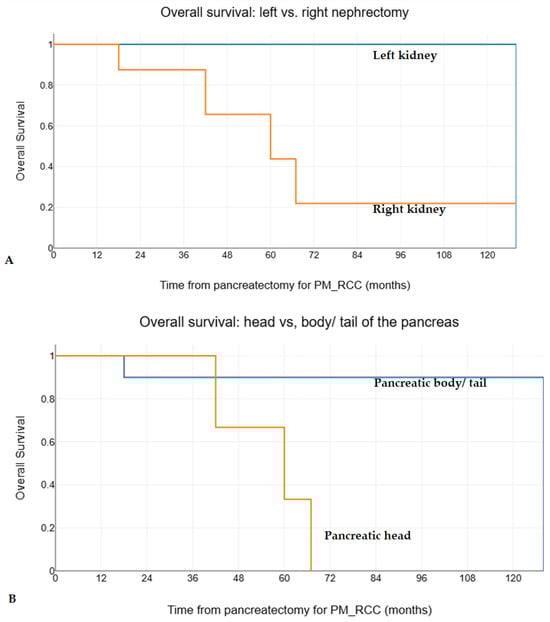 There is no correlation between the site of RCC (left vs. right kidney) and the development of PM_RCC within the pancreas [,,,,], also demonstrated in this series. However, in the present study, left kidney RCC was associated with statistically significantly better overall survival after pancreatectomy for PM_RCC (Figure 3A), while no impact was observed on disease-free survival. Other studies failed to show any effect on the survival of the primary tumor location [].