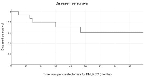 The recurrence rate after pancreatectomies for PM_RCC was frequent—35.2% to 71.6% [,,,,,,,,,,,,,], and it was associated with symptomatology, number, and size of PM_RCC, extrapancreatic disease, and limited pancreatic resection [,,]. Thus, a few studies reported an increased recurrence rate in patients with standard pancreatic resection [], explained by the imbalance between the host immunological reaction and a slow-growing tumor. The recurrence rate in the present cohort was 30%, but no predictors of disease-free survival were identified, as a recent study has also shown []. The reported median disease-free survival in previously published studies varies between 22 and 107.5 months [,,,,].