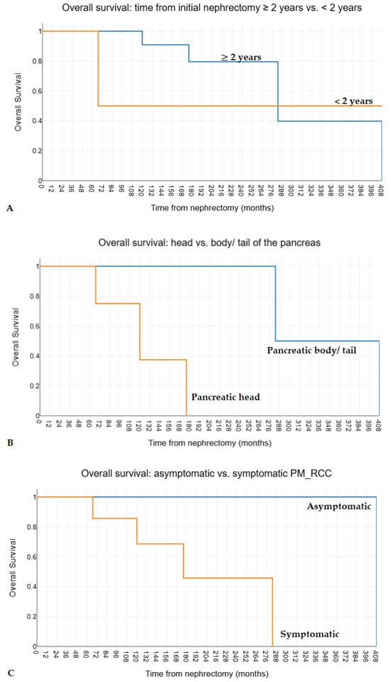 The long-term disease-free interval between the nephrectomy for RCC and PM_RCC occurrence is considered a particular pattern [,,]. It might be a surrogate for a less aggressive biological disease that warrants a pancreatectomy in PM_RCC []. The long period between RCC resection and the PM_RCC appearance can be explained by the initial equilibrium between dormant micrometastases and the immune system, which is disrupted by the activation of angiogenesis within the tumoral microenvironment [] and the decline of immunity by immunosenescence and chronic inflammation []. Furthermore, recent studies have shown that PM_RCC presents unique immunological features, including a low intratumoral density of CD8+ and FOXP3+ lymphocytes and CD8+ T cells and fibroblasts as the most active incoming and outgoing components of the tumor microenvironment. A particular pattern of primary RCC appears to be correlated with PM_RCC occurrence []. These situations may reflect its less aggressive nature and potentially better prognosis than other metastatic sites [,,]. A longer time to metastasis development after initial diagnosis of RCC is associated with improved survival, as an analysis of 7386 patients has shown [], while other studies failed to show any impact on the survival of the interval between nephrectomy and PM_RCC occurrence [,,,,,]. A few studies have reported a median interval of 58 to 156 months between nephrectomy and PM_RCC occurrence [,,,,,,,,,,,,,,,,,]; the most significant part of studies reported intervals longer than 10 years []. Nevertheless, the most prolonged interval between nephrectomy and PM_RCC resection reported in the literature is 32.7 years []. In the present cohort, the median interval between nephrectomy for RCC and PM_RCC occurrence was 104 months (the largest being 280 months); an interval after initial nephrectomy for RCC > 2 years was associated with statistically significantly better overall survival after initial nephrectomy for RCC (Figure 4A), but no impact on disease-free survival or overall survival after PM_RCC was observed. Masetti and coworkers also associated at least 2 years after nephrectomy for RCCC with significantly better overall survival []. Considering the appearance of PM_RCC during a highly variable, sometimes long interval from the initial nephrectomy, these patients require a close, indefinite follow-up.