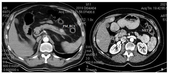 In the tail of the pancreas, a hypervascular appearance of PM_RCC (A) and NET_P (B) at contrast-enhanced axial computed tomography, arterial phase (PM_RCC—pancreatic metastasis of renal cell carcinoma origin; NET_P—neuroendocrine tumor of the pancreas).