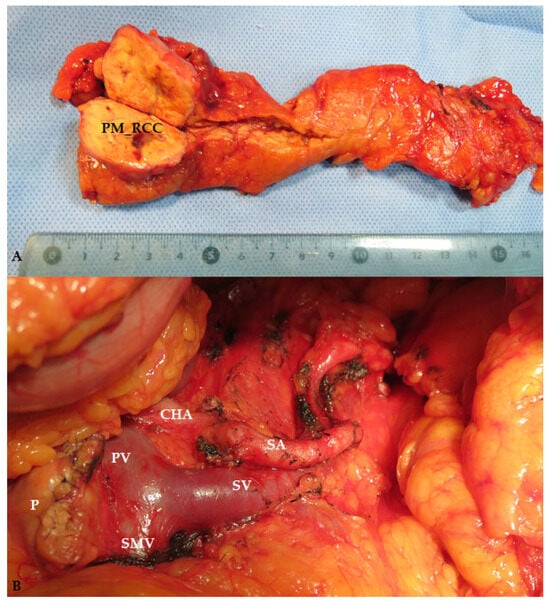 Operative specimen (A) and intraoperative aspects (B) after spleen-preserving distal pancreatectomy for PM_RCC (PM_RCC—pancreatic metastasis of renal cell carcinoma origin; P—pancreatic head; CHA—common hepatic artery; SA—spleen artery; PV—portal vein; SMV—superior mesenteric vein; SV—spleen vein).