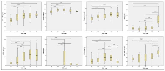 - Mihai, S.; Codrici, E.; Popescu, I.D.; Enciu, A.M.; Rusu, E.; Zilisteanu, D.; Necula, L.G.; Anton, G.; Tanase, C. Inflammation-related patterns in the clinical staging and severity assessment of chronic kidney disease. Dis. Markers 2019, 2019, 1814304. [Google Scholar] [CrossRef] [PubMed]