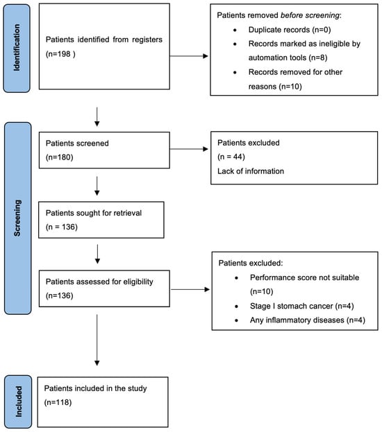 The sample size analysis with a type 1 error of 0.05, a power of 95%, and an effect size (d) of 0.86 revealed the minimum number to be reached to be 82 patients. As there were no studies in the literature to refer to, the effect size was calculated in a pilot study using our database. A total of 188 early-stage gastric cancer patients applied to 4 centres during the study period; among them, 118 were included in the study based on the inclusion and exclusion criteria (Figure 1).