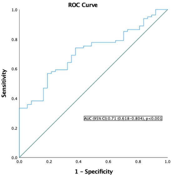 The HALP cutoff was found using the ROC test to predict the pathological response status. After the HALP score cut-off was determined to be 28.9 AUC = 0.71 (p < 0.001, Figure 2), the patients were divided into two groups, with low (<28.9) and high (≥28.9) HALP scores.