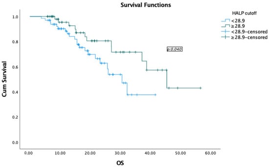 Overall survival according to the HALP score cutoff. OS, Overall survival; cum, cumulative.