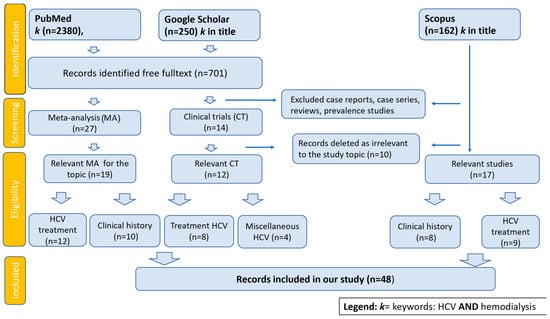 To identify relevant research for this review, we examined the PubMed, Google Scholar, and Scopus databases, spanning the years 1989 to 2024, with the keywords “HCV AND hemodialysis”. Three different investigators collected the data independently, and finally, the results were confronted. The PRISMA statement was consulted throughout this review.