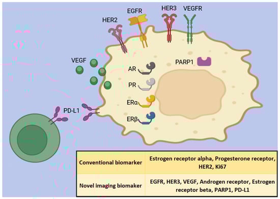 With recent attention and advancements, Positron Emission Tomography (PET) molecular imaging has emerged as a promising tool for assessing breast cancer biomarkers thanks to its high quantitative ability and resolution [21]. Furthermore, numerous additional biomarkers (EGFR, HER3, VEGF, androgen receptors, etc.) have been identified as playing significant roles in treatment options and prognosis, supplementing the conventional classifications.