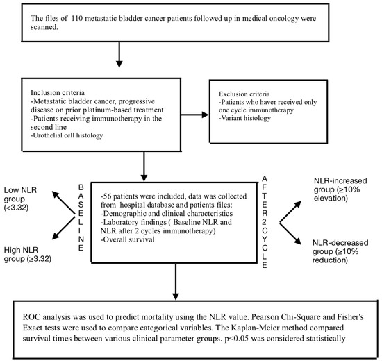 Bladder cancer (BC) is the tenth most commonly diagnosed cancer worldwide, with approximately 550,000 new cases annually [1,2]. Urothelial carcinoma is the dominant histologic type and presents a significant cause of mortality, with a 5-year survival rate of about 5% for the metastatic disease [3]. Approximately 10–15% of patients are diagnosed with metastatic bladder cancer (mBC) at the time of presentation. As such, developing new treatment strategies is crucial for metastatic bladder cancer patients with a poor prognosis [4]. The combination of pembrolizumab and enfortumab vedotin is the preferred regimen of eligible patients for cisplatin treatment [5]. However, for patients who cannot receive this combination treatment, the preferred path is platinum-based chemotherapy. Single-agent immunotherapy in Programmed Death Ligand 1 (PD-L1)-positive patients is recommended in platin-ineligible patients. For second-line therapy in metastatic disease, immunotherapy is recommended regardless of PD-L1 positivity [6]. Although PD-L1 positivity predicts a benefit from immunotherapy in first-line treatment, it is not clear under what conditions patients will benefit from immunotherapy as a second-line treatment. Therefore, predictive markers must be detected in peripheral blood to show that immunotherapy is beneficial for patients with metastatic bladder cancer. Complete blood count tests can easily determine the morphology of blood and can be routinely checked before each treatment. In many malignancies, the neutrophil-to-lymphocyte ratio (NLR) is strongly associated with systemic inflammation and retains a substantial prognostic value [7,8]. In retrospective studies and immunotherapy for bladder cancer, a high baseline NLR is associated with a poor prognosis and is an independent prognostic factor [9,10].