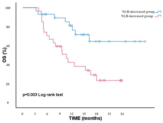Moreover, we analyzed the correlation between the NLR-increased/decreased groups and OS. The results showed that patients with a decreased NLR after two treatment cycles had a significantly longer OS than patients with an increased NLR [p = 0.003, (95% CI, 7.95–12.75)]. At the time of the analysis, the OS of patients treated with immunotherapy was 15 months (95% 10.20–21.75). During a follow-up period of approximately 24 months, the median OS was 10 months in the NLR-increased group and less in the NLR-decreased group (Figure 3).