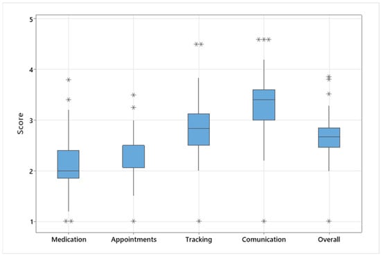 Figure 1 offers a general view of the differences in score distribution. The boxplot evaluates the shape, the central tendency, and the variability of the registered score distribution and offers the possibility to identify extreme or atypical values which can be seen flagged by asterisks. By analyzing the boxplot, we can find that the scores for medication management are the lowest, followed by those for medical appointments and health tracking, while the highest value was obtained for the communication skills section. This suggests that patients may need more intensive or specific medication management training.