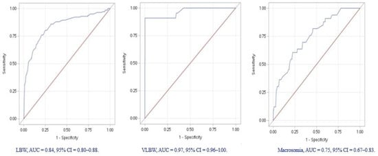 The effect of preterm birth (PTB) as a risk factor of LBW and VLBW is undeniable as shown in Table 4. PTB is the strong predictor of VLBW, with high sensitivity and specificity, as shown in the ROC model (Figure 1). Furthermore, and consistent with previous reports [,], our results showed that LBW is associated with maternal hypertensive disorders during pregnancy.