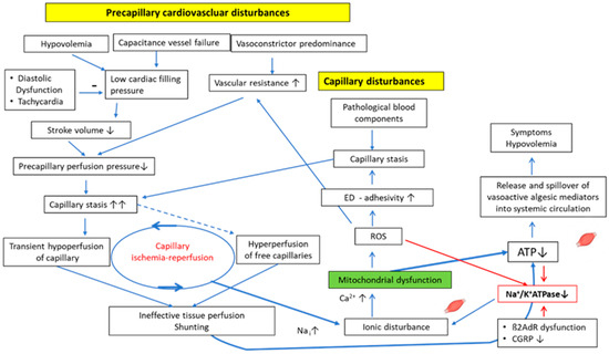 Proposed mechanisms of induction of the mitochondrial dysfunction as a result of the combined effect of perfusion disturbances, which are already shown in Figure 1, and an insufficient rise in the Na+/K+-ATPase activity in skeletal muscle. Mitochondrial dysfunction impairs perfusion via ROS and favors itself by lowering the Na+/K+-ATPase activity via ROS and low ATP. The poor energetic situation leads to the excessive production and spillover of vasoactive algesic mediators that can reach every organ to cause symptoms and induce hypovolemia. ED: endothelial dysfunction. Red arrows: strong inhibitory effect. Red box: The Na/K ATPase has a key role for the cellular homeostasis. (−) means inhibition.