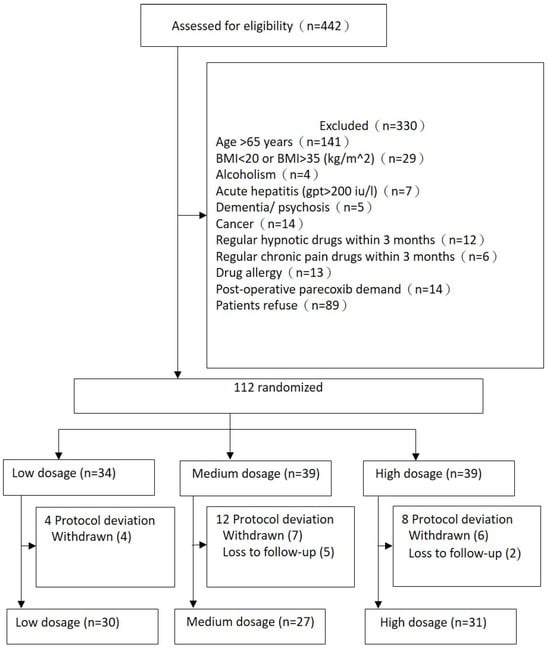 Between July 2019 and August 2021, 112 patients arranged for elective laparoscopic cholecystectomy at Kaohsiung Medical University Chung-Ho Memorial Hospital were enrolled in our study and were randomly assigned into low- (n = 34), medium- (n = 39), or high-dosage (n = 39) groups, respectively. There were protocol deviations due to the intolerance to the adverse effects of experiment drugs, due to patients asking for higher medical care quality with multimodal analgesia (there were two participants in the low-dosage group, two participants in the medium-dosage group, and one participant in the high-dosage group who asked for NSAIDs), or patients being lost to follow-up due to early discharge. This study finally enrolled 88 patients. The flow chart of sample enrollment is shown in Figure 1. Follow-up ended in August 2021.
