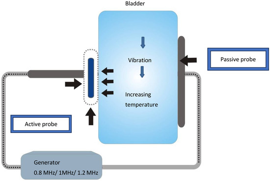 The patients were lying in the lithotomy position with stretched lower extremities. Probes were placed on the lower part of the abdomen in the area of the bladder (active probe) and on the lumbar spine (passive probe), as shown in Figure 1. A capacitive probe in the “free treatment”/“power control” program was used, where high-frequency electricity was released to the bladder for 20 min with a frequency of 1.0 MHz and energy limited to that which could produce a maximum temperature of 41 °C. Initially, a maximum energy of 75% and a frequency of 0.8 MHz were applied, which were reduced depending on the amount of heat that was pleasant for the patient. Then, the power was reduced to 50% and the frequency increased to 1.0 MHz, which resulted in moderate energy absorption. The procedure with this level of energy was continued until the end, and the patients absorbed 18–19 kJ of energy on average.