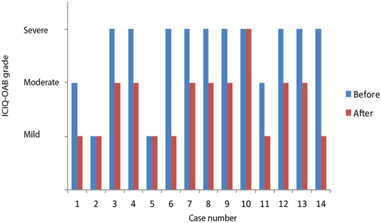 Of those we included in our assessment, there was no difference in symptomatology after the RF procedure in patients 2 and 5 (Figure 3). For all other patients, a significant decrease in OAB symptomatology was shown.