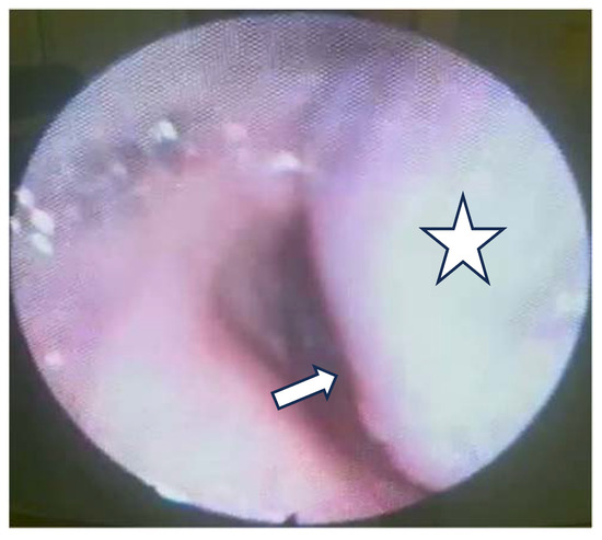 The tumor bulges into the laryngeal inlet (the laryngeal inlet is marked by the arrow and the tumor by a star).