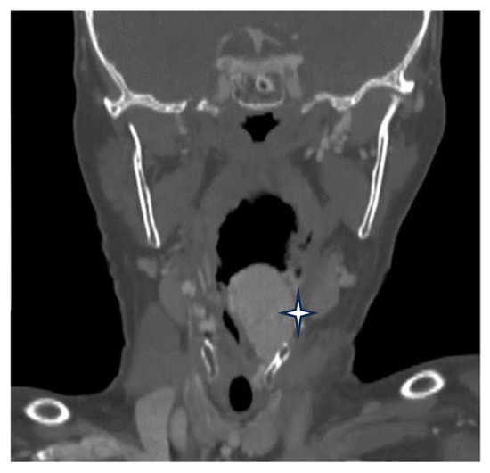 A postcontrast computer-tomography (CT) scan of the neck revealed an expanding tumor, which was intensely enhancing and heterogenous, with dimensions of 28/24 mm in diameter. It had mainly developed inside the hypopharynx and larynx and centered itself at the left pyriform sinus that deviates the epiglottis, embedding itself in the left aryepiglottic fold, the arytenoid cartilage, and the false vocal fold, and bulging into the laryngeal inlet, thereby coming into close contact with the right arytenoid cartilage. At the upper pole, it extended from the greater horn of the hyoid bone along the entire length of the thyroid cartilage, down to a line that passed across the level as that of the arytenoid cartilage. The CT scan bilaterally objectified the presence of some enlarged cervical lymph nodes in group III (Figure 2).