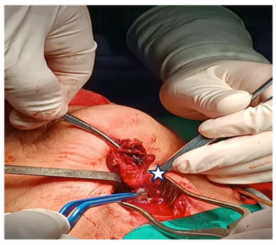 Sectioning and ligation of the left superior thyroid artery (white arrow) and the external carotid artery (pointed to by the star).