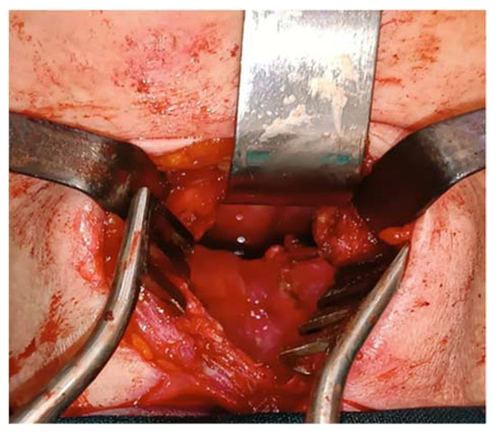A vertical incision on the anterior midline of the neck was made, with dissection of the deep layers, retraction of the strap muscles, and exposure of the thyroid cartilage all undertaken. A vertical incision along the midline of the cartilage and a laryngofissure were performed, and the two flaps were retracted, thus exposing the tumor. Using bipolar cautery and blunt instruments, the tumor was resected, and the local bleeding was stopped while we simultaneously took care not to cause any unnecessary injuries to the larynx or the pharynx (Figure 5 and Figure 6). We removed the thread from the external carotid artery before closing the thyroid to check if any bleeding might occur and to prevent any unnecessary complications that might appear.