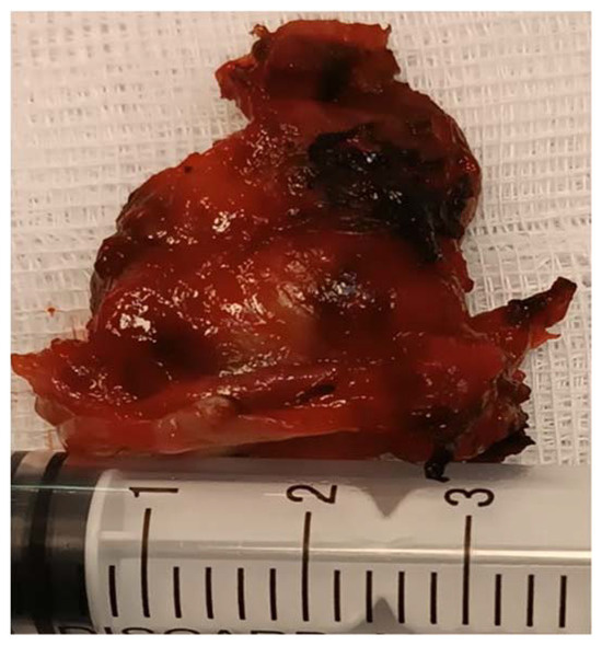 A tumor of 30/30 mm was resected and was sent to the anatomic pathology department (Figure 7). The histological result confirmed the diagnosis of a laryngeal paraganglioma.