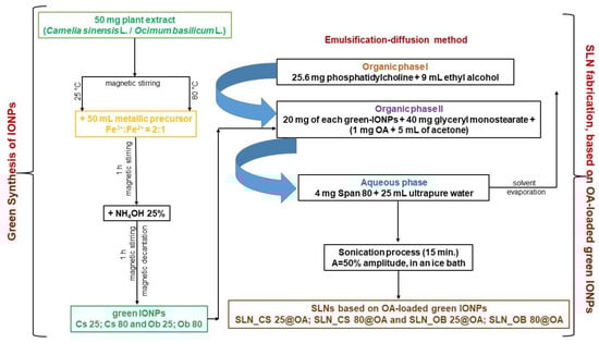 The solid lipid nanoparticle (SLN) test samples consist of iron oxide nanoparticles (IONPs) obtained by green synthesis, followed by loading them with a pentacyclic triterpene–oleanolic acid (OA). The fabrication of green iron oxide nanoparticles (green-IONPs) was started from 2 alcoholic extracts based on Camellia sinensis and Ocimum basilicum plant materials. It was established that the fabrication process occurs at two different temperatures: at 25 °C and 80 °C, respectively. Thus, four green-IONP samples were obtained, which were noted as CS 25, CS 80, OB 25, and OB 80. The detailed protocol regarding the preparation of the extracts as well as the protocol regarding the fabrication of green-IONPs are extensively explained in previously reported research effectuated by Moaca and co-workers [].