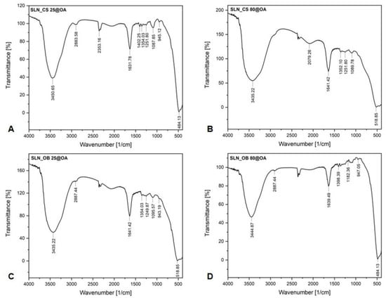 As can be noticed, there are no significant differences between the absorption bands of each sample. All FTIR spectra show the most important absorption maxima recorded. It is observed that the samples based on green IONPs obtained from the two extracts at 25 °C (Figure 2A,C) show more absorption maxima than the samples based on green IONPs obtained at 80 °C (Figure 2B,D). The first important and strong absorption bands are at 3450.65/3452.22 cm−1 recorded in the case of SLN samples based OA-loaded green IONPs obtained from Camellia sinensis L. extract, and at 3435.22/3444.87 cm−1 recorded in the case of SLN samples based on OA-loaded green IONPs obtained from Ocimum basilicum L. extract, which can be assigned to the O–H stretching vibration (hydroxyl groups (H-bonded)) present in water, alcohols, or phenols contained in the extracts of green tea and basil plant materials, as well as to N–H stretching in amines. The absorption band from 2883.58 cm−1 recorded in the case of the SLN_CS 25@OA sample, and the adsorption bands from 2887.44 cm−1 recorded in the case of the SLN_OB 25@OA and SLN_OB 80@OA samples, can be attributed to the saturated aliphatic C–H stretching bonds in alkanes, suggesting the occurrence of an aromatic ring attachment. The absorption peak from 2353.16 cm−1, recorded only in the case of the SLN_CS 25@OA sample, corresponds to the O=C=O stretching functional group. The absorption peaks located around 1600 cm−1, recorded in the case of all the SLNs samples, could be associated with the symmetric and asymmetric bending modes of C=O bonds of amino acid and esters, respectively, from the plant extracts, as well as to C=C stretching functional groups from the aromatic ring. The absorption peak from the 1402.25 cm−1 wavenumber, recorded only in the case of the SLN_CS 25@OA sample, revealed the presence of C–H bending from aromatic compounds and alkanes (methylene group). The absorption peaks recorded around 1300 cm−1, in all four spectra, are attributed to the C–H bending vibration of alkanes, referring to the binding of the aromatic ring –C–H for the in-plane bending absorption. The peaks recorded around 1200 cm−1, in the SLN_CS 25@OA, SLN_CS 80@OA, and SLN_OB 25@OA samples, corresponds to the aromatic acid ester C–O stretching vibration, most probably from the aromatic carbonyl acids present in both extracts. The absorption peak from 1182.36 cm−1, recorded only in the case of the SLN_OB 80@OA sample, can be attributed to the C–O stretching functional groups from esters or tertiary alcohols present in the extract. The peaks from 1087.85 cm−1, 1089.78 cm−1, and 1095.57 cm−1, recorded in the case of the SLN_CS 25@OA, SLN_CS 80@OA, and SLN_OB 25@OA samples, are assigned to the C–O stretching functional groups from aliphatic ethers or to the C–O stretching functional groups from primary and secondary alcohols. The absorption peaks around 900 cm−1, recorded in the case of SLN_CS 25@OA, SLN_OB 25@OA, and SLN_OB 80@OA, may correspond to the =C–H bending functional groups from alkenes or to the C=C bending monosubstituted functional groups from alkanes. The last absorption peaks recorded in all four FT-IR spectra, located in the inorganic domain (at 484.13 cm−1 in the case of the SLN_CS 25@OA and SLN_OB 80@OA samples, and at 518.85 cm−1 in the case of the SLN_CS 80@OA and SLN_OB 25@OA samples), correspond to the Fe-O stretching vibration from green IONPs.