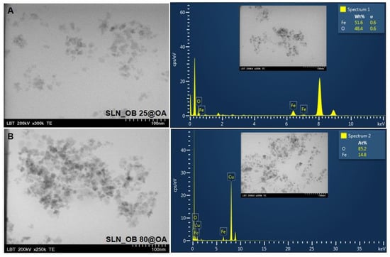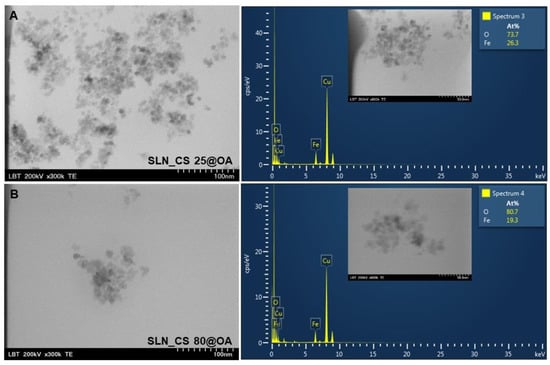TEM images and EDX spectra of SLN based on OA-loaded with green-IONPs obtained from Camellia sinensis alcoholic extract at 25 °C (A) and at 80 °C (B).
