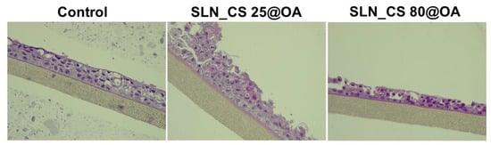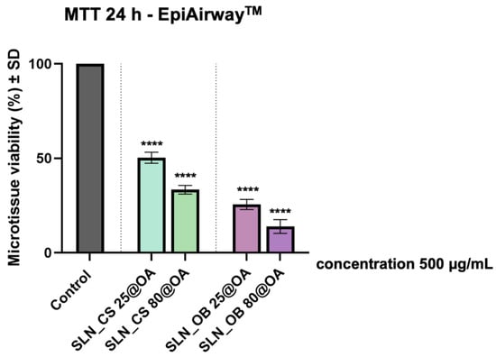 To assess the biosafety profile of SLN test samples (SLN_CS 25@OA, SLN_CS 80@OA, SLN_OB 25@OA, SLN_OB 80@OA) at a concentration of 500 µg/mL, a human respiratory functional microtissue model—EpiAirwayTM—was used. All the handling conditions were realized according to the manufacturer’s standard operation procedure (SOP), as described in detail in the study reported by Moaca et al. [].