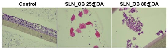 Concerning the EpiAirwayTM 3D model treated with sample SLN_OB 25@OA, at 500 µg/mL, this shows apoptotic squamous cells and hyperkeratosis. The SLN_OB 80@OA sample at a concentration of 500 µg/mL induces autolysis on respiratory tract epithelium.