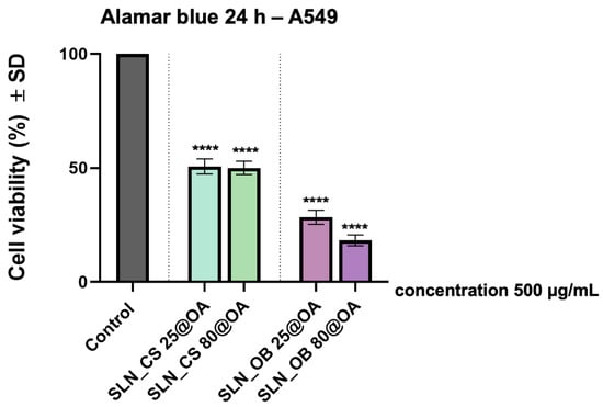 The effect induced by SLN samples (SLN_CS 25@OA, SLN_CS 80@OA, SLN_OB 25@OA, SLN_OB 80@OA) at a concentration of 500 µg/mL on the A549 lung cancer cell line 24 h post treatment was analyzed using the Alamar blue colorimetric test, performed as previously described []. In brief, the cells were seeded onto 96-well plates to an initial density of 1 × 104 cells/well and were cultured until the confluence reached 80%. Afterward, the cells were exposed to SLN samples; also, control cells were included, which were treated only with a culture medium. Quantification of the cell viability rate was determined by reading the absorbance at two different wavelengths (570 nm and 600 nm) using the xMarkTM microplate reader (Bio-Rad Laboratories, Hercules, CA, USA) and applying a previously published formula [].