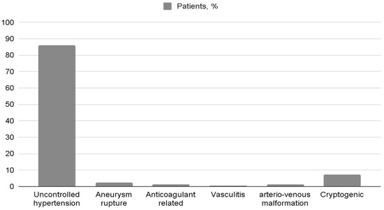 In the hemorrhagic stroke patient group, 51.0% were females, 49.0% were males, and the mean age was 71.7 ± 14.4 years (Table 1). In total, 82.6% of these patients had spontaneous intracerebral hemorrhage; in 86.0% of cases, this was caused by uncontrolled hypertension; in 2.6% by the rupture of an aneurysm; in 1.3%, this was related to anticoagulation therapy; in 1.3% due to vasculitis; in 1.3% due to arterio-venous malformation; and in 7.3% of cases due to cryptogenic etiology (Figure 2).