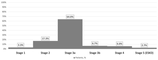 In most cases (59.3%), the hemorrhage was localized in the right hemisphere. Of these cases, 64.0% had stage 3a chronic kidney disease, 17.3% had stage 2, 6.7% had stage 3b, 6.0% had stage 4, 3.3% had stage 1, and 2.7% had end-stage kidney disease (Figure 3).