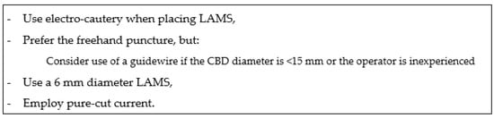 We recommend the free-hand technique when the CBD diameter exceeds 15 mm; a 6 or 8 mm LAMS is optimal (Figure 1). A recent case series found that, in univariate analysis, use of a guidewire after fine-needle aspiration puncture of the dilated CBD was a risk factor for technical failure [,].