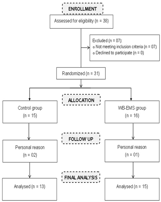 The study sample was randomized using a computer random number generator, employing a simple randomization method to allocate participants into two distinct groups. The first group engaged in WB-EMS training (n = 16), while the second group was the control group (n = 15) (See Figure 1). We ensured that each participant had an equal chance of being assigned to either group, minimizing bias and enhancing the internal validity of the study. Randomized assignment was conducted after participants met the inclusion criteria.