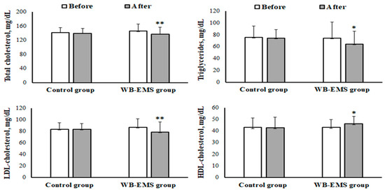 Mean ± SD of levels of total cholesterol, triglycerides, high-density lipoprotein cholesterol (HDL-cholesterol), and low-density lipoprotein cholesterol (LDL-cholesterol) before and after the whole-body electromyostimulation (WB-EMS) training program in obese young females. * p < 0.05; ** p < 0.01 (significant difference before and after program).