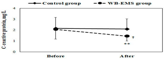 Mean ± SD of plasma C-reactive protein concentration in obese young females before and after the whole-body electromyostimulation (WB-EMS) training program. † p < 0.05 (significant difference between groups); ** p < 0.01 (significant difference before and after program).