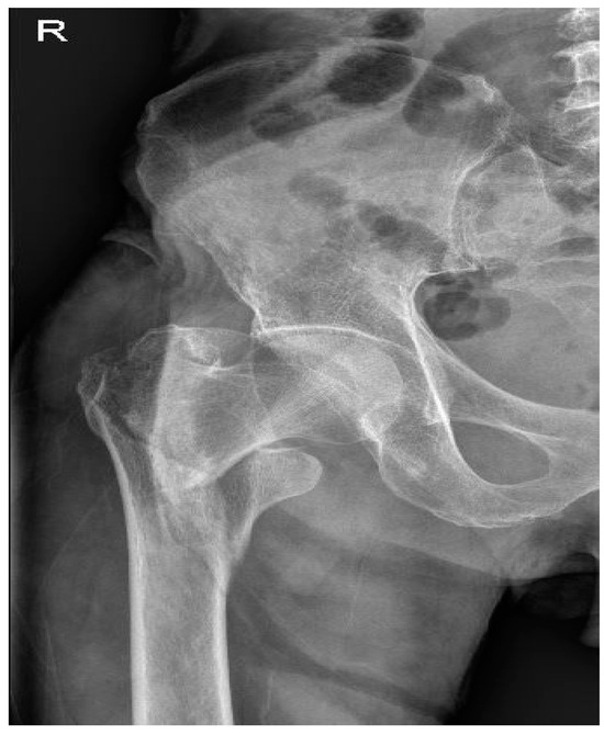 We obtained prior informed consent from the patient and approval from Institutional Review Board and Human Research Ethics Committee of Soonchunhyang University Cheonan Hospital (approval no.: 2023-10-034; date of approval: 3 November 2023) to publish this case report. The patient was a 76-year-old male with a history of hypertension and type 2 diabetes mellitus (DM). Prior to the surgery, the patient had been taking valsartan (20 mg), aspirin (100 mg), lasix (20 mg), and linagliptin (5 mg) daily for hypertension and diabetes mellitus, as well as two subcutaneous injections of ultra-long-acting insulin per day. He was diagnosed with a right hip femur intertrochanter fracture (Figure 1) and was scheduled for total hip replacement arthroplasty under general anesthesia. Echocardiography performed 3 years prior showed a left ventricular ejection fraction (LVEF) of 68%, and a second echocardiography was not performed until the anesthesia.