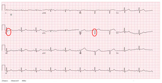 An electrocardiogram (EKG) performed immediately before the anesthesia (Figure 2) showed pathologic Q waves on V2, based on which septal infraction was suspected. However, since myocardial infarction could not be diagnosed solely based on abnormal EKG findings [5] and the patient maintained a BP of 150/70 mmHg before induction of anesthesia, we decided to proceed with the surgery without additional cardiac evaluation so that the patient can ambulate as soon as possible, considering his old age. Prior to inducing anesthesia, EKG, non-invasive blood pressure, pulse oximeter, and bispectral index monitoring devices were placed on the patient. Due to a pleth variability index (PVI) of 16% shown on the pulse oximeter before induction, we suspected dehydration. However, the patient had higher-than-normal BP, was communicating well, and did not complain of symptoms such as poor physical state, and propofol—a commonly used anesthetic—was used for the induction. As the required propofol dosage for induction decreases with advancing age [6], 1 mg/kg of propofol was administered. After loss of consciousness, sevoflurane 1 MAC was administered to maintain the anesthesia. Subsequently, rocuronium (0.8 mg/kg) was administered for muscle block. After the induction of anesthesia, BP dropped to 54/38 mmHg; therefore, ephedrine 8 mg (vasopressor) was administered. Subsequently, BP increased to 83/54 mmHg and endotracheal intubation was performed. Due to the airway stimulation from intubation, BP was elevated to 134/78 mmHg. Following radial arterial cannulation, stroke volume variation (SVV) measured on Vigileo FloTrac system©WT McGee MD 2005 was 16%, again confirming hypovolemia. Further, the cardiac index was 2.1 L/min/m2, suggesting impaired cardiac functions. A few minutes later, BP dropped again to 58/32 mmHg, and although a bolus of epinephrine (30 mcg) temporarily elevated the BP to 120/60 mmHg, the systolic blood pressure (SBP) again dropped to the 60 s. In addition, there was a clear new-onset ST depression observed on the EKG after induction, suggestive of sudden cardiac ischemia. As total hip arthroplasty may involve massive bleeding, normal BP was not maintained after the administration of anesthetics, and EKG showed ischemic findings, the anesthesiologist determined that the anesthesia should be discontinued. Upon discussion with the surgeon, anesthesia was discontinued. Subsequently, sevoflurane was stopped, and the patient’s vital signs measured immediately after the patient woke up were as follows: BP, 93/55 mmHg; HR, 71 beats/min. The patient was transferred to the intensive care unit from the operating room, and the initial BP assessment showed that the BP had recovered to the pre-anesthesia state (143/88 mmHg). Emergent echocardiography performed after anesthesia showed mild left ventricular dysfunction and near-normal ejection fraction at 45–50%.