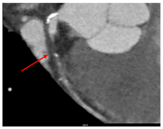 Computed tomography (CT) heart angio and calcium score were performed, as recommended per cardiologist consult, and near total occlusion of the proximal left anterior descending artery (pLAD) was found (Figure 3).