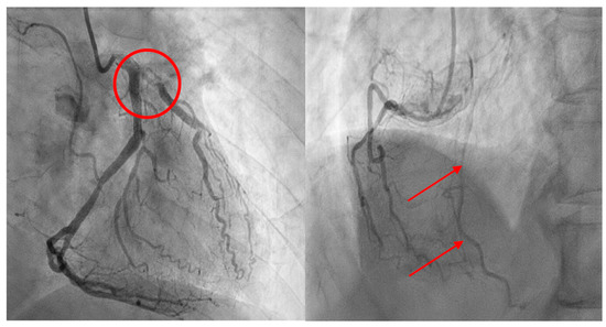 Coronary angiogram shows occlusion of the Proximal left anterior descending artery (Circle) (Left) and formation of collateral circulation in the right artery (Arrows) (Right).