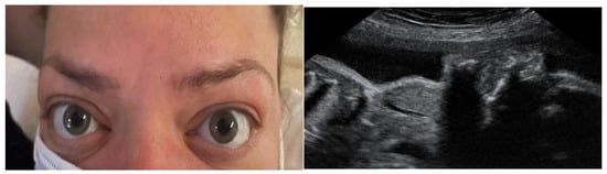 Orbithopathy in a pregnant woman with Graves’ disease (left). The fetus was diagnosed with goiter by ultrasound (right).