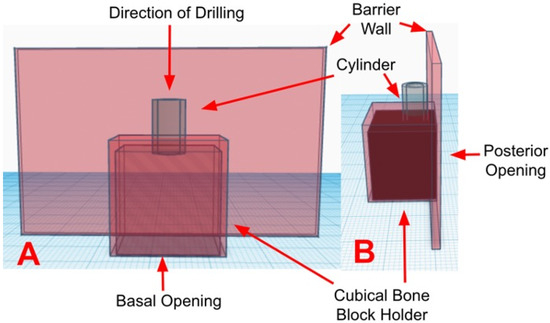 Illustrates a CAD schematic of the surgical guide design featuring a cylinder without cooling features (solid), a cubical holder, and a barrier wall. The basal opening allowed for the placement of the cubical bone block. The posterior opening allowed for the direct evaluation of temperature using a thermographic camera. The barrier wall prevented coolant from obstructing measurements. (A) indicates an anterior view. (B) indicates a lateral view. The software used for the design was a free web application called TinkerCAD (Autodesk Inc., San Rafael, CA, USA).